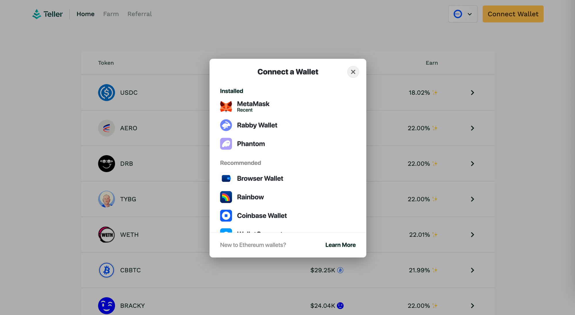 Step 1: View the Base pools on Teller: app.teller.org/base/earn
