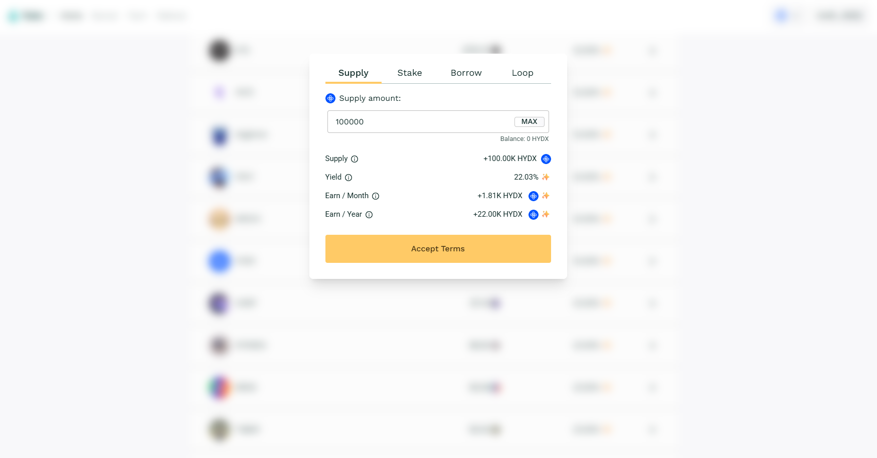 You can now supply and stake your $HYDX on Teller to earn 22% APY per block.