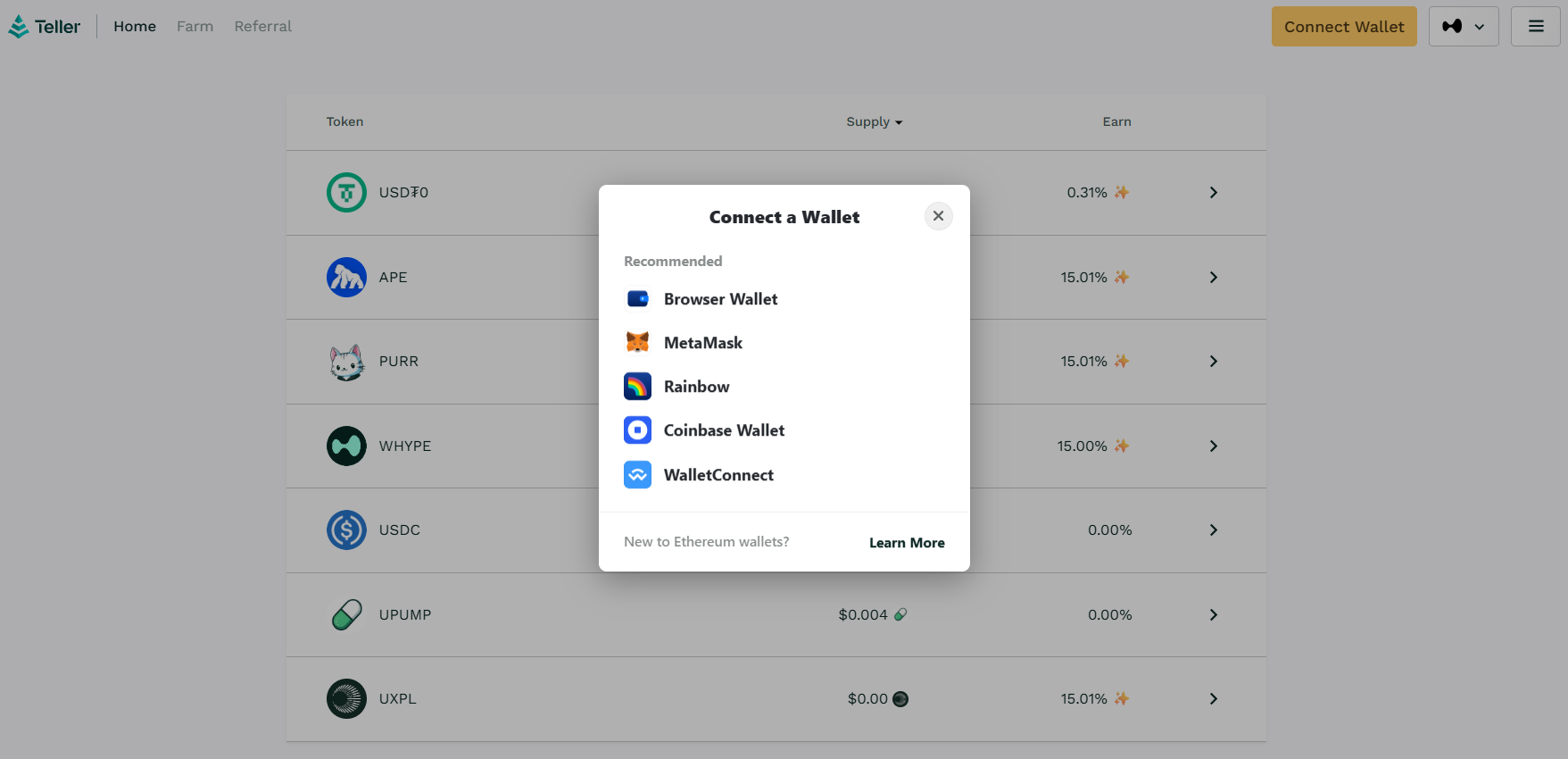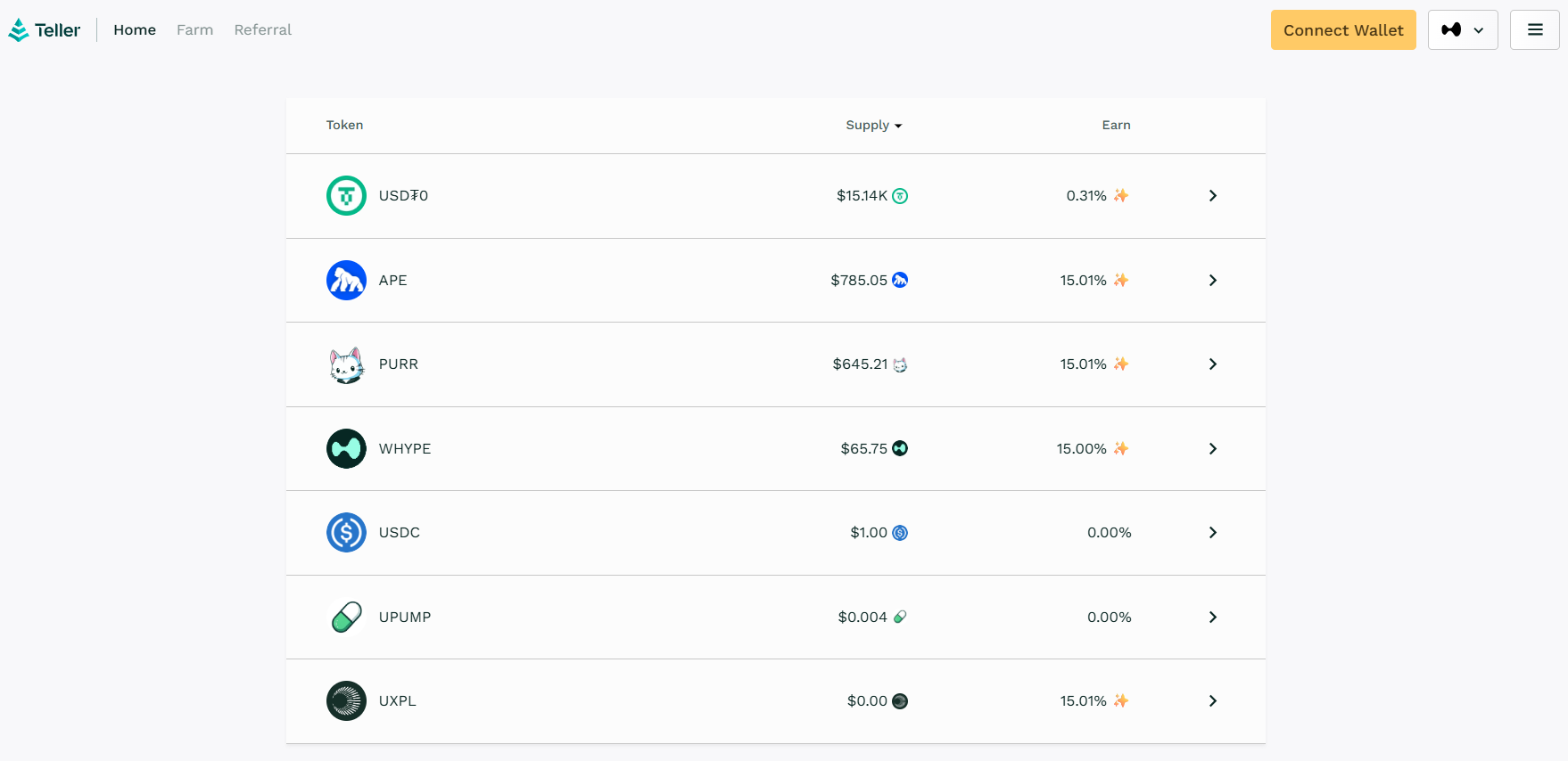 Step 1: View the HyperEVM pools on Teller: app.teller.org/hyperevm/earn