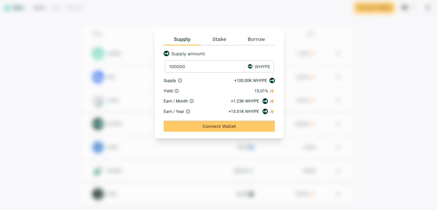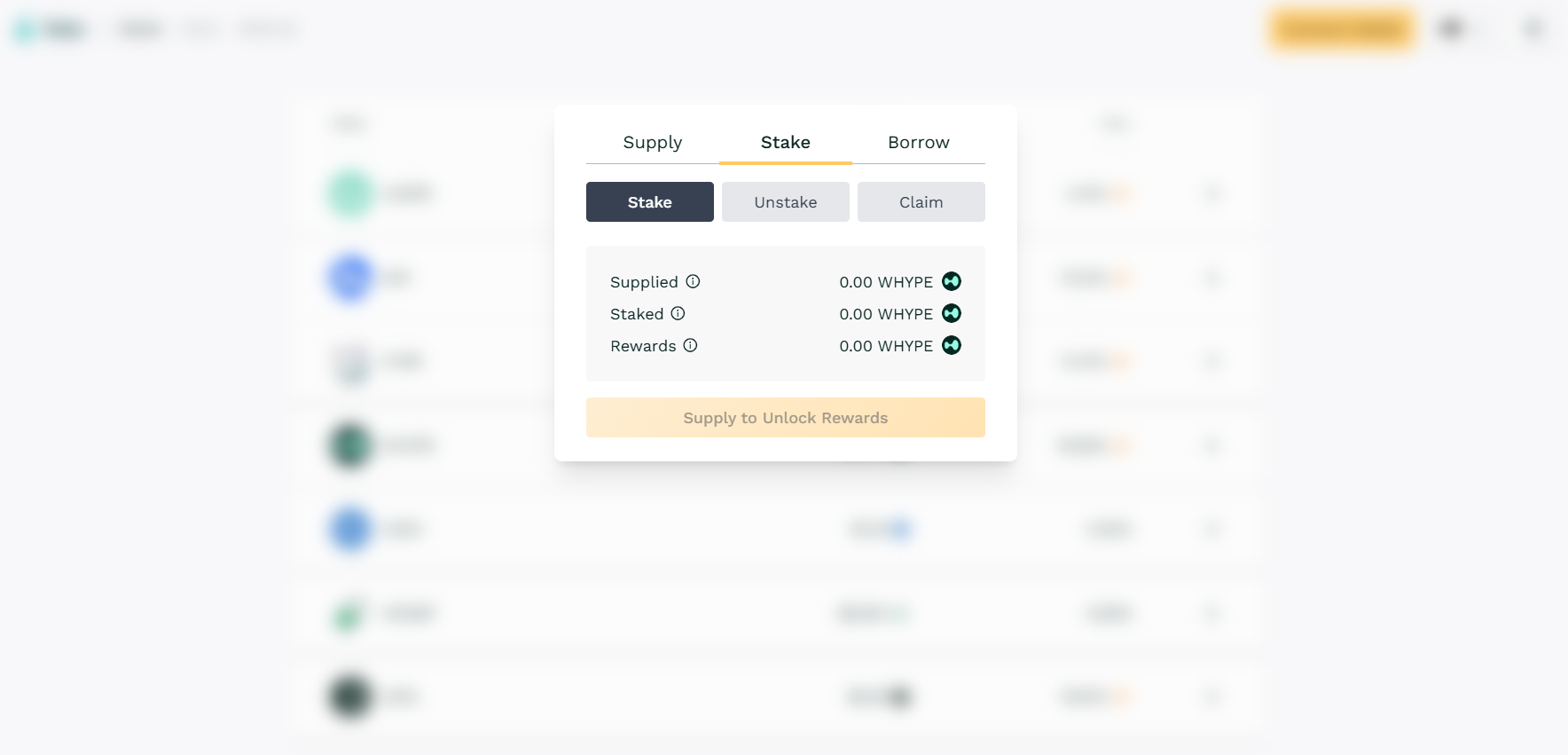 Supply and stake your tokens to start earning $WHYPE per block.